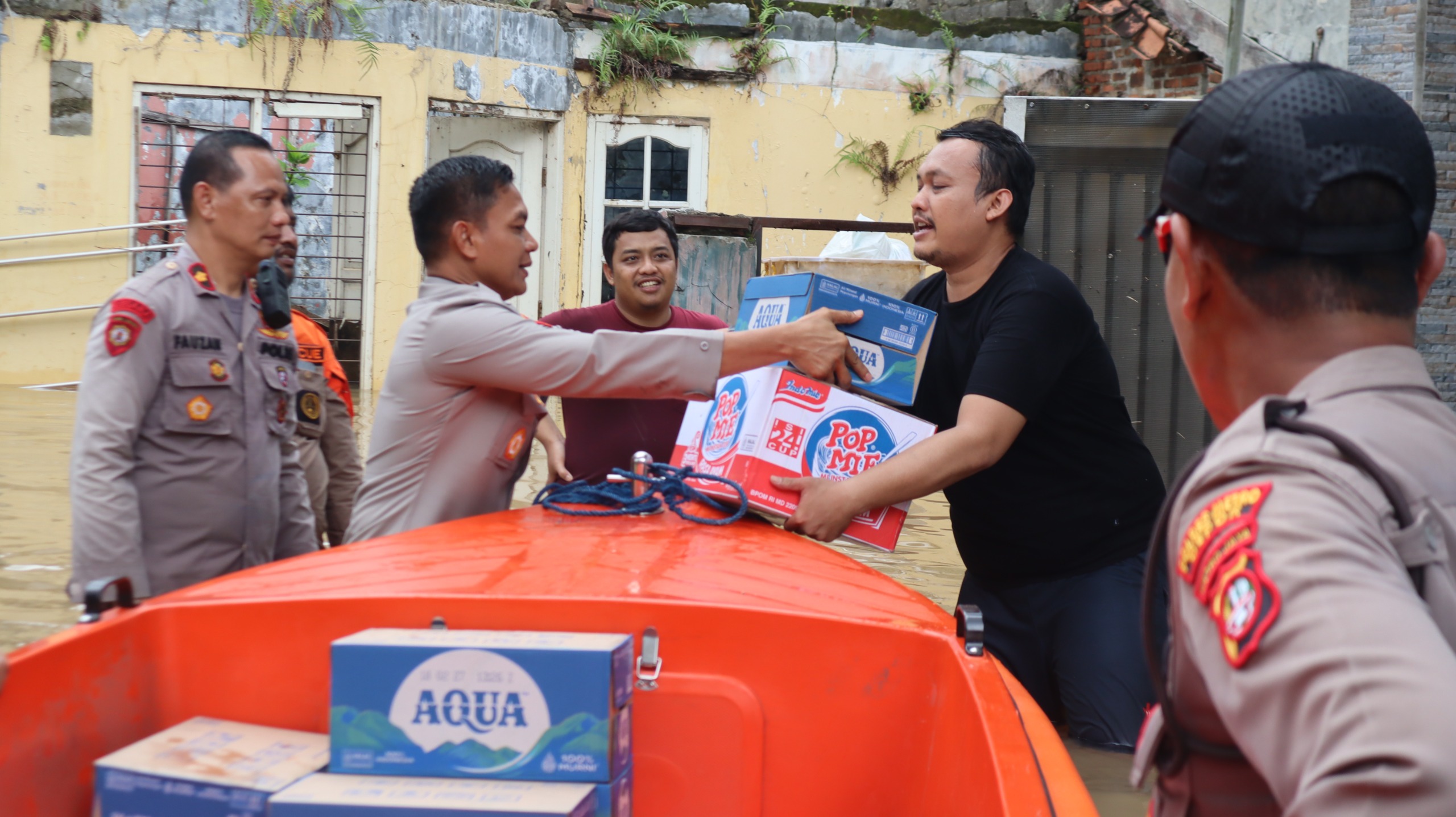 Mereka bersama-sama memberikan mie instan kepada warga yang masih bertahan di rumahnya masing-masing menggunakan perahu karet. Tampak banjir di lokasi juga mulai surut.