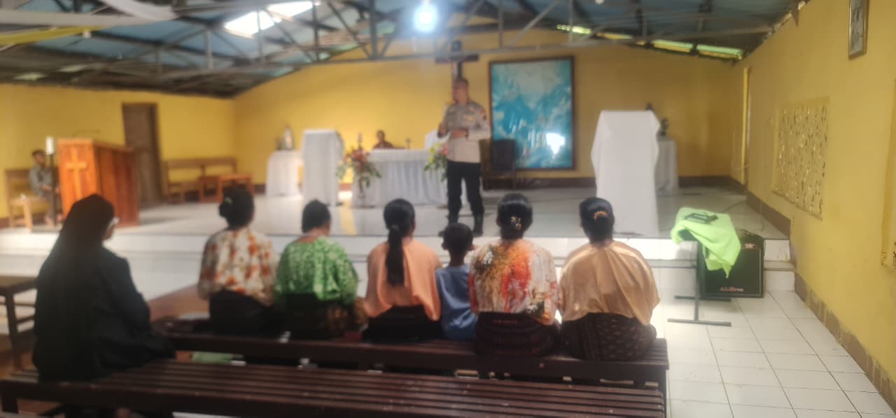Ende, Initerkini.com – Dalam menciptakan Sitkamtibmas yang kondusif diwilayah Hukumnya, Kapolsek Wolowaru Ipda Ubaldus Maku, S. Sos hadir menyapa umat Stasi Pemo dalam kegiatan Minggu Kasih sekaligus memberikan pesan pesan kamtibmas. Minggu (12/10/2025) Pukul 16.00 Wita.