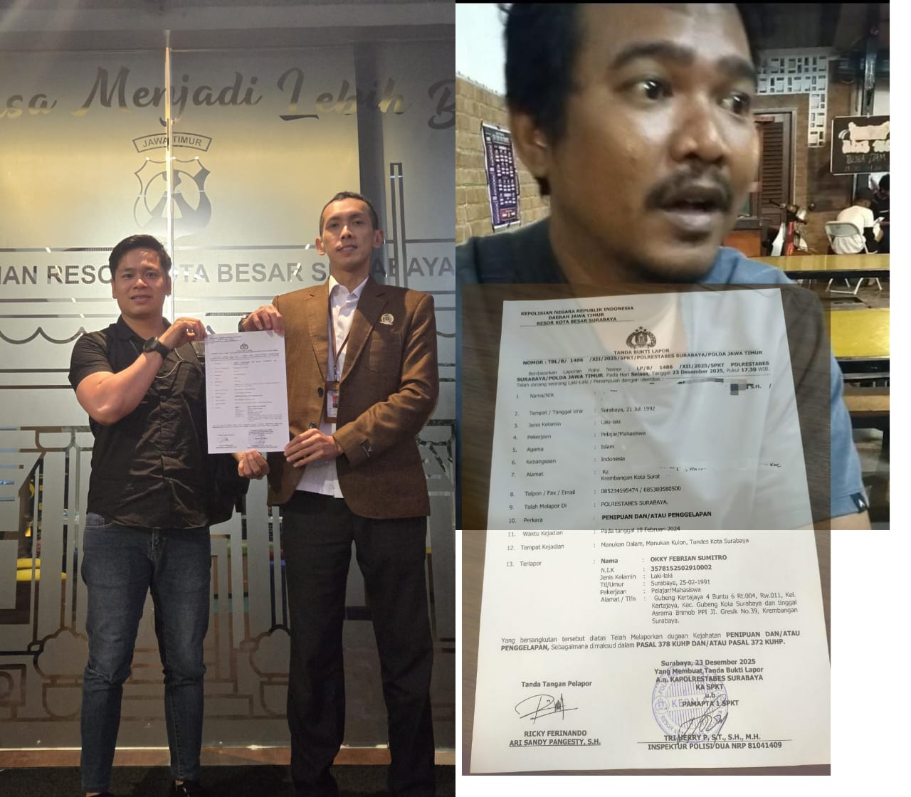 Akhirnya Korban RF Didampingi kuasa hukumnya Ketua Umum Organisasi Advokat Pembela Umum Indonesia (PUMI) Rahadi,S.H.M.H. melaporkan peristiwa pidana tersebut ke Polrestabes Surabaya.Laporan diterima oleh SPKT POLRESTABES No : TBL/B/1486/XII/2025/SPKT POLRESTABES SURABAYA/POLDA JAWA TIMUR tentang dugaan tindak pidana penipuan dan atau penggelapan sebagaimana dimaksud dalam pasal 372 KUHP dan atau 378 KUHP dengan ancaman hukuman maksimal 4 tahun penjara.