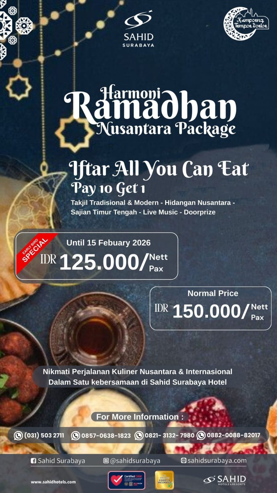 Sebagai bentuk apresiasi bagi para tamu, Sahid Surabaya Hotel menghadirkan penawaran spesial Pay 10 Get 1, dengan harga IDR 125.000 nett per pax yang berlaku hingga 15 Februari 2026. Sementara itu, harga normal ditawarkan sebesar IDR 150.000 nett per pax, menjadikan paket ini pilihan tepat untuk acara berbuka puasa bersama dalam suasana elegan dan penuh makna.