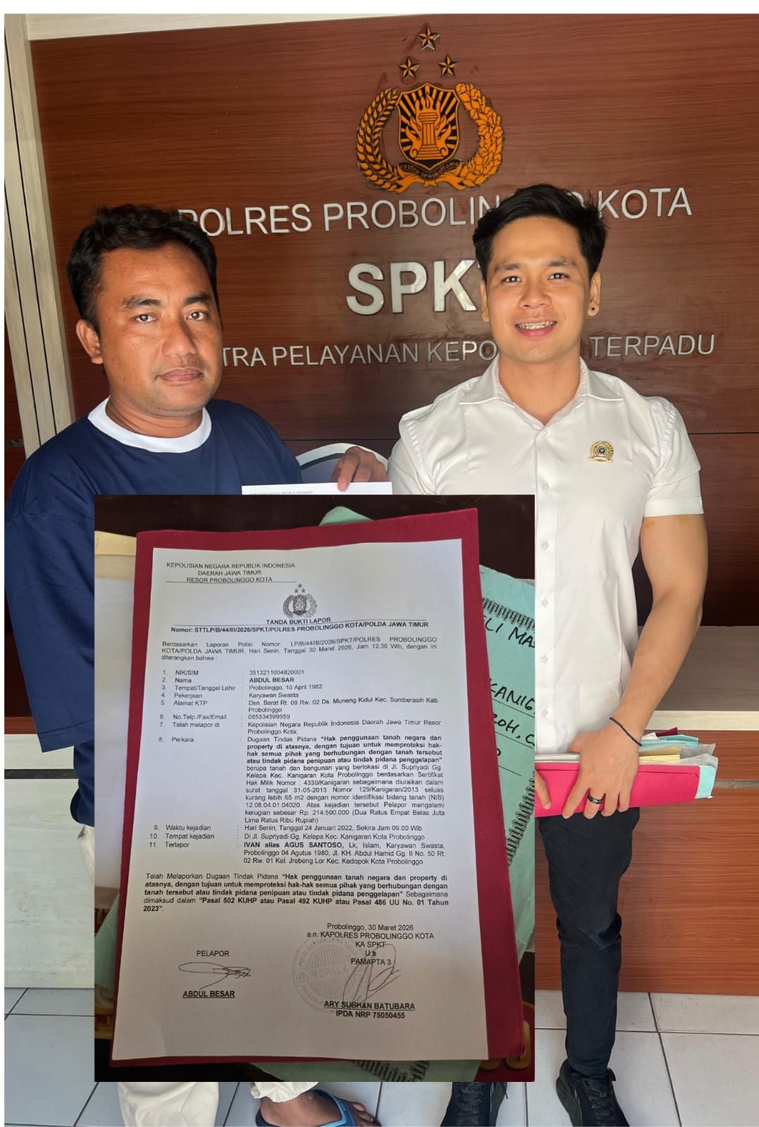 Akhirnya Oleh sebab kejadian tersebut di atas (AB) Beserta Penasehat Hukumnya Melaporkan Peristiwa tersebut Di POLRES PROBOLINGGO KOTA POLDA JAWA TIMUR Dengan NOMOR: LP/B/44/III/2026/SPKT/POLRES PROBOLINGGO KOTA/POLDA JAWA TIMUR. Hari senin Tanggal 30 maret 2026